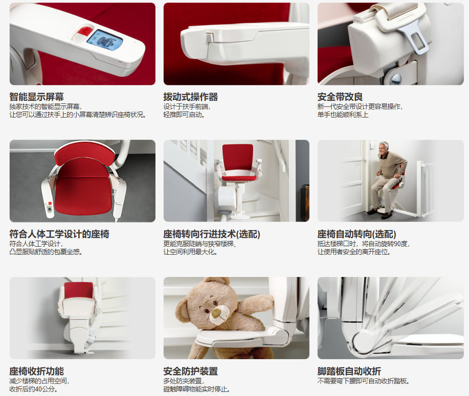 Otolift 以恰到好处的简约美学设计,荣获德国红点设计大奖。其 Modul-Air Smart 具备市场最新技术,以及快速安装的优势。并可依需求提供多样化停站设计,优化楼梯口与走道规划,打造专属于您的舒适居家空间。结合显示屏幕,让您随时轻松掌握升降椅运行状况。